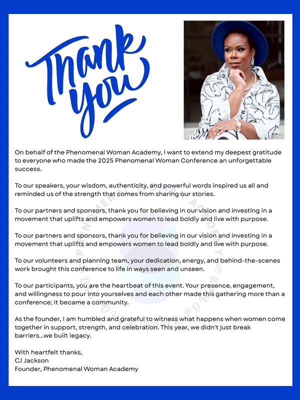 We are thrilled to invite you to the 4th Annual Phenomenal Woman Conference, a powerful gathering of women and young ladies coming together to inspire, uplift, and create lasting impact. This year's theme, BREAKING BARRIERS AND BUILDING LEGACY, is about pushing past obstacles and leaving a meaningful mark on the world. This one-day event will feature a dynamic keynote speaker, engaging breakout sessions, and an opportunity to connect with phenomenal women from all walks of life.